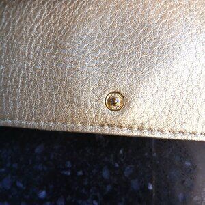 This wallet is in gorgeous condition. There MAY be an ever-so-slight rub on the bottom corner (see the pics). But, I can't even really tell. For the sake of honesty, I am letting a purchaser know this. Otherwise, it is like-new. It measures 8x4 inches. The wallet has a back open pocket with 10 card slots inside and 1 main zip-up middle pocket.