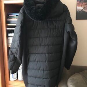 Black Michael Kors coat in great condition. Small belt is missing. The size says 2X. Could be a coat to the knee for shorter person or a jacket for taller person. From under arm to bottom of jacket is approx 24" and width when zipped up is approx 29". Measurement at back of coat (without hood) is approx. 33" from where hood attaches to the bottom of coat. Very warm and not too puffy. Comes with a detachable hood with faux fur. Great coat for winter