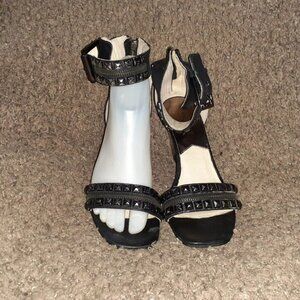 Michael Kors black leather sandals, with gunmetal hardware, decorative zipper and 2 rows of square studs on toe straps, as well as on the ankle bracelet. Elastic embedded at ankle buckle for stretch comfort when walking.