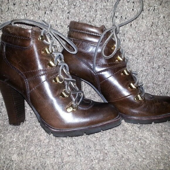 Cute pair of Michael Kors booties in a rich brown leather with gold hardware detailing and leather laces. 3.5 inch stacked heel with winter grip rubber soles.