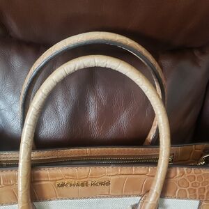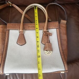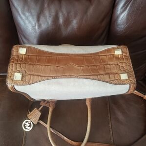 Sturdy canvas and rich embossed leather make for the perfect textural mix on this sophisticated Michael Kors satchel in Canvas/Embossed leather MK hangtag medallion Polish gold hardware Zip top closure Khaki signature interior lining, 3 multifunctional slip pockets, 1 zip compartment.