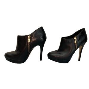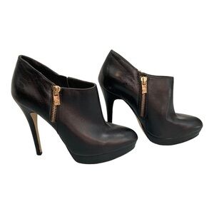 These are the beautiful Michael Kors York booties (style 40F2YOHE7L) in a size 7. Black leather outer with snakeskin print along the back and heel. Gold zipper with signature MK zipper pull on each side of each boot. Slight platform of about 0.75” with total heel height of about 4.75”. No scuffs, have been freshly polished. One tiny nick out of one heel as shown, so small it is not visible when worn. Hardly any creasing at all on top, lots of life left in the soles