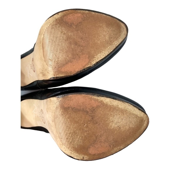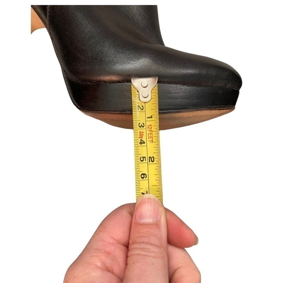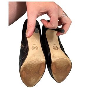 These are the beautiful Michael Kors York booties (style 40F2YOHE7L) in a size 7. Black leather outer with snakeskin print along the back and heel. Gold zipper with signature MK zipper pull on each side of each boot. Slight platform of about 0.75” with total heel height of about 4.75”. No scuffs, have been freshly polished. One tiny nick out of one heel as shown, so small it is not visible when worn. Hardly any creasing at all on top, lots of life left in the soles