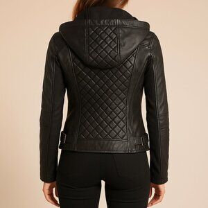 • Quilted panels on shoulders, sides, and hood for that luxe biker twist