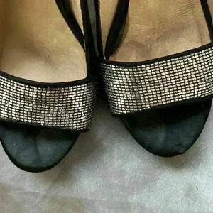 BLACK 4.5" high heeled Elastic Sling back shoes. The shoe is made of a black satin like fabric and open toed with silver rhinestone pattern. Perfect for special occasions There is no damage on the heels. Good condition.