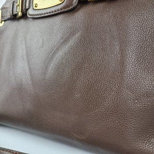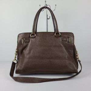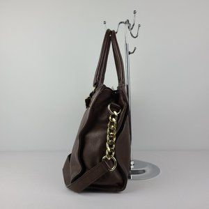 Gently used brown MK bag with gold-tone hardware. Dual handles with detachable strap. The longer strap does not go cross-body, it's just slightly longer than the handles. Some scratches on the gold nameplate from use and indents from storage. (shown in last photo).