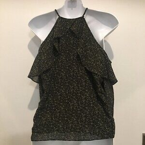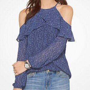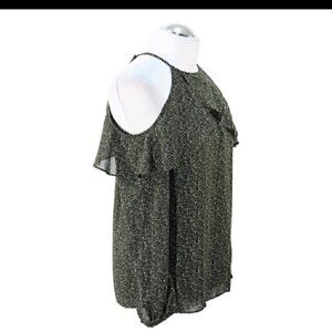 Michael Kors Cold Shoulder Top. An all-over black, white and green floral print and has been designed with on-trend cold shoulder detail and a frill to the front and back. Team with jeans and boots to complete the look. Excellent preowned condition.