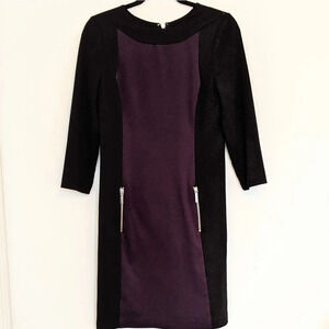 Features: Crewneck, Silhouette, Ponte knit, midi, over the knee, black & purple / aubergine colour block dress with zipper pockets and exposed back zipper closure, 3/4 sleeves short long sleeves. Lined.