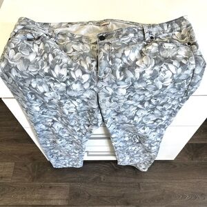 Stylish skinny jeans with a floral pattern. Features a blend of black and gray tones. Perfect for a chic look.