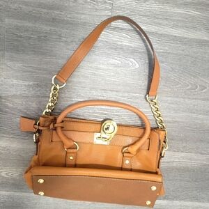 This sophisticated shoulder bag by MICHAEL Michael Kors features a structured design in smooth tan leather, complemented by gold-tone hardware. The decorative chain detail on the strap adds a touch of elegance, making it a timeless accessory for any occasion.