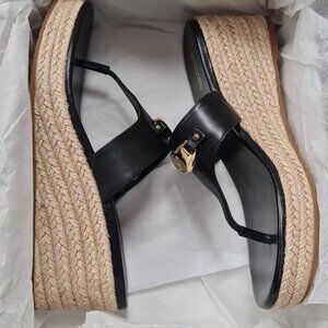 New ⬆️see pictures 40T1TLMS1L Leather upper Thong toe Slip-on style Polyurethane/viscose/polyester lining Padded insole Rubber sole Jute-wrapped wedge heel, 2.5" Platform height, 0.75" Leather thongs atop a jute-wrapped platform wedge heel.
