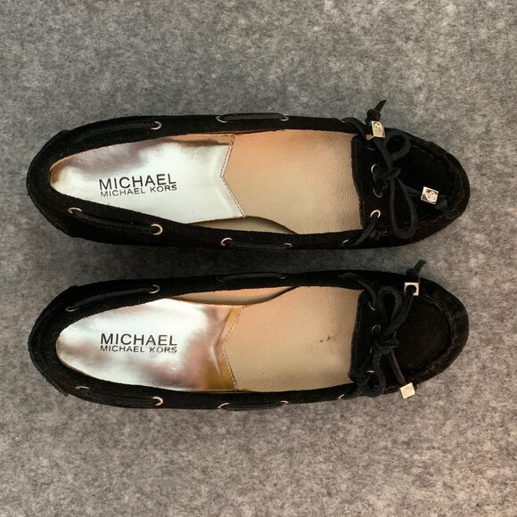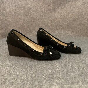 MICHAEL Michael Kors Women's Black Leather Wedge Suede Slip on Heel Bow Shoes