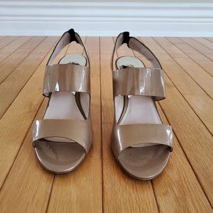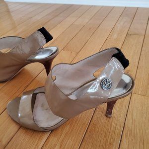 MICHAEL Michael Kors beige patent leather strappy sandals with elastic part on back strap; silver colored MK emblem on strap. 3" heel. Size 8. sole has been topy'd.
