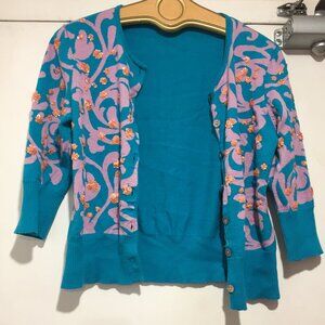 Michael Simon Cardigan Sweater, Lightweight Size L, Color Blue, Purple, 82% Cotton, 16% Silk, Pattern Embellished, Three-Quarter Sleeve, Closure Button Down, Good Condition, Relaxed Fit, Great Look, Great Fit.