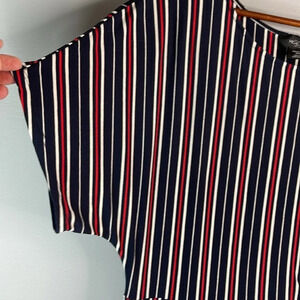 Women’s navy blue, red and white Michel Studio Collection vertical Striped Maxi Dress.