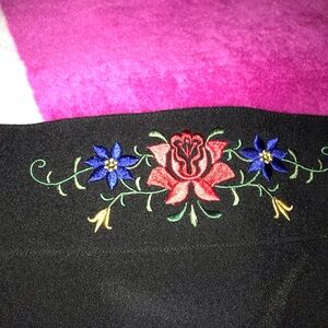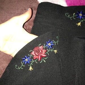 🌹 Super beautiful midnight floral graphics🙈✨, zip up and button closure on the back. Has 2 spacious pockets at the front. Silk underlay in skirt interior 25” length.