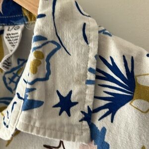Channel effortless beachy vibes in this Midnight Sky cropped button-up top, perfect for warm days and carefree styling. Featuring a tropical hand-drawn print, this piece blends coastal charm with a modern, boxy silhouette. Made from a breathable mix of rayon, cotton, and linen, it’s lightweight and ideal for layering or wearing solo.