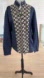 Mid West Garment Co (MWG) long sleeve button front shirt with mandarin collar and small ruffle around collar. Back yoke, sleeves and sides are navy blue and there is a contast cream, green and navy fabric down the centre of the front and and back. Geometric zig zag and key pattern on the contrast fabric. Two buttons on cuff to adjust cuff width. Made in Canada. 65% polyester/ 35% cotton.