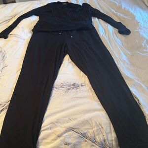 A long-sleeve, V-neck design with a drop shoulder and jogger-style pants.