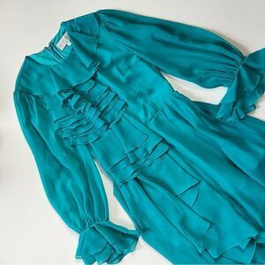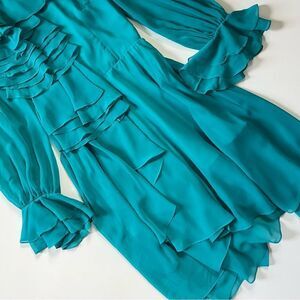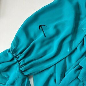 Very good condition. Hiding under the front ruffles are some unfinished seams by the manufacturer as seen in last 2 photos. Not visible at all unless you're actively lifting the ruffles up to look underneath them but of course wanted to mention. There are also 2 tiny spots on one sleeve as well as a *slight* run on the back near the zipper. All extremely minor.