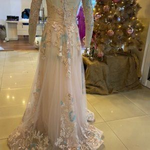 MIKAEL D blush gown with turquoise Guipure lace detail
