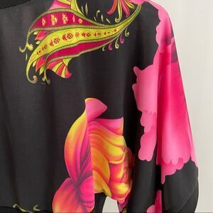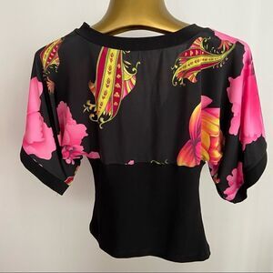 Black yellow pink floral paisley stretchy top, small, low cut the front, stretch tube waist, EUC, neck to hem 18 inches, armpit to armpit 13.5 inches, bottom hem side to side 14 inches.