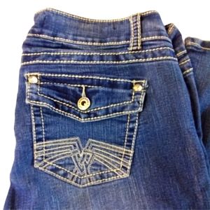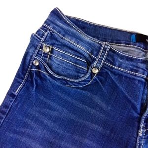 Features: Six pocket design with button on back pockets, wider leg at hem measuring 10.5", zipper fly