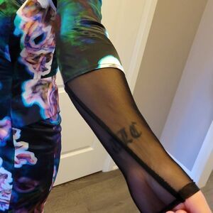 3/4 sleeves with black sheer mesh at bottom of sleeves
