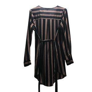 Chic and flattering striped wrap-style dress by MINE. Features a black base with vertical rust, white, and taupe stripes that elongate the silhouette. The tie-waist belt allows for a custom fit, and the lightweight woven fabric drapes beautifully. Perfect for work, dinner, or day-to-night styling.