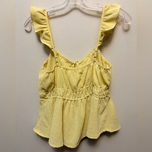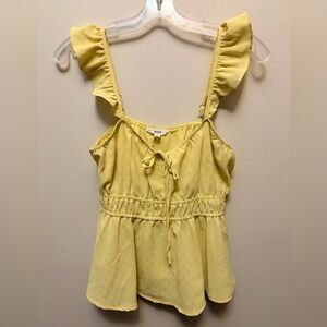 Chic yellow top with ruffle straps. Features a tie front and gathered waist. Ideal for casual outings.