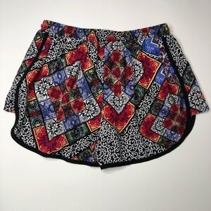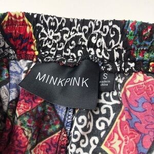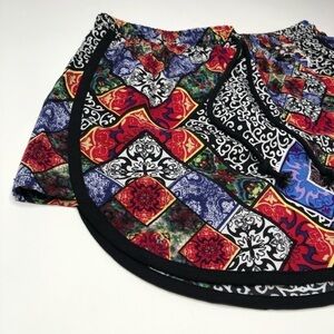 MINKPINK boho hippie artsy multi-colored colorful shorts in a flowy material. A beautiful swirl pattern in black and white with blue, red and green Indian inspired pattern as well. Has an elastic waist with a drawstring. The sides are shorter than the front and back so it gives it a beautiful sexy silhouette. Super cute with a ribbed white crop top. Please see photos and video for measurements and details. Women’s size SMALL.