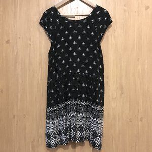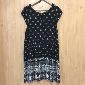 Excellent preowned condition, drop waist, crepe fabric, black babydoll dress by MINKPINK. Features white thunderbird pattern distributed throughout, and a repeating geometric design along the bottom. This dress has only been worn once if at all, and is in 'like new' condition. Absolutely gorgeous and hangs beautifully for a flattering fit.