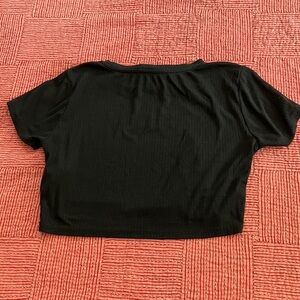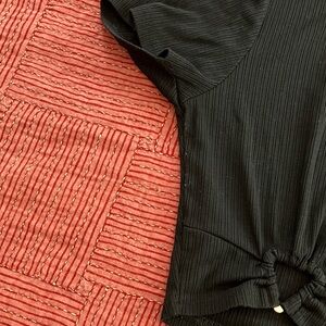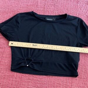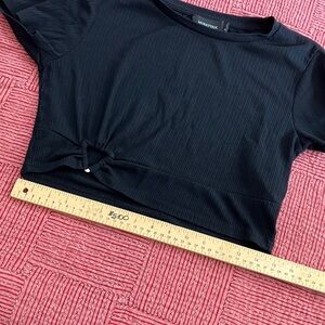 AI Chic black ribbed crop top with a stylish front knot. Ideal for casual outings.