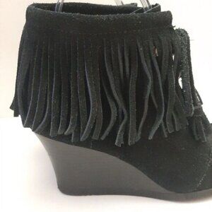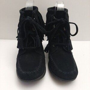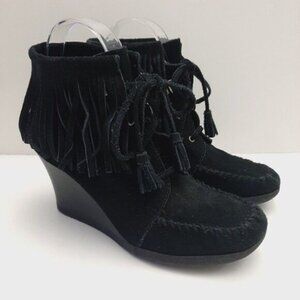 MINNETONKA Fringe Suede Lace-Up Wedge Heel Booties Black Size 6.5