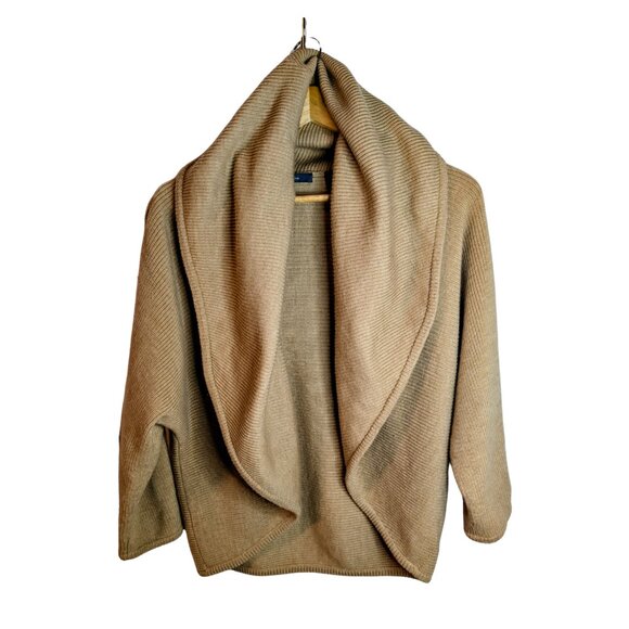 Beautifully made Liz Claiborne camel cardigan in 100% merino wool. This piece is soft & cozy and drapes effortlessly. The generous shawl collar and dolman-style sleeves give it an easy, refined look, while the open-front design keeps it modern and versatile. A timeless layering piece that feels effortlessly luxe. MINT CONDITION.