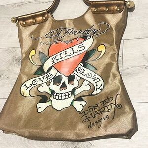ed hardy tote, ed hardy bag, y2k style, tattoo print bag, christian audigier, skull bag, gothic tote, streetwear accessories, punk rock style, collector fashion, 2000s style bag, love kills slowly, retro tote, metallic gold tote, statement bag