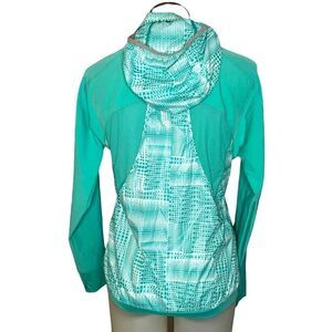 The color is stunning and fabric is very thin, water repellent. This jacket is very breathable with mesh fabric panels, many pockets and hood can be tucked in or out. There is also a thumbhole in cuff.