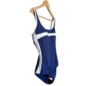 DESCRIPTION: A sporty one piece in blue, white and a touch of black. Full coverage. Built in shelf bra and cups.