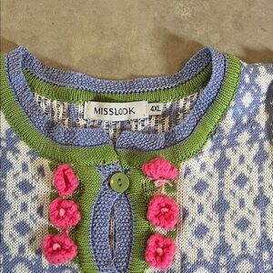 Charming cardigan with blue and green knit. Features pink floral accents. Ideal for a stylish touch.