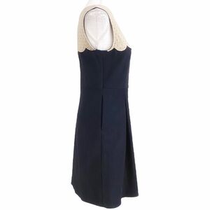 MISS PATINA NAVY BEIGE POLKA DOT SCALLOPED CONTRAST BIB SLEEVELESS A-LINE DRESS