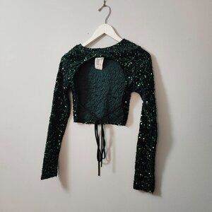 Mistyrose hunter green velvet sequin top. Cropped style. Open back from tie. New with tags.