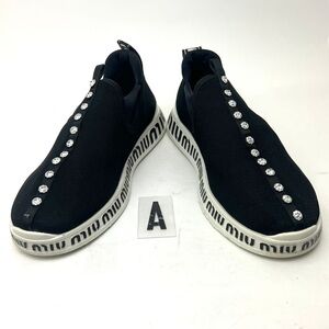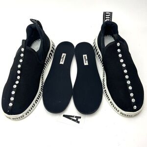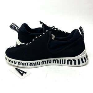 Bold logo letters wrap the sole of a knit slip-on detailed with a playfully chic row of jewel-like studs.