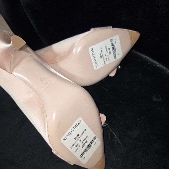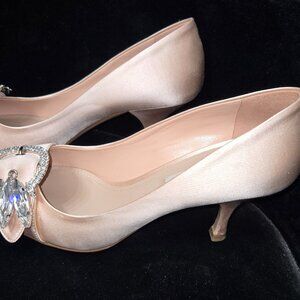 MIU MIU Prada light pink Orchidea satin jeweled crystal buckle point toe, kitten heel wedding pumps.