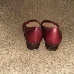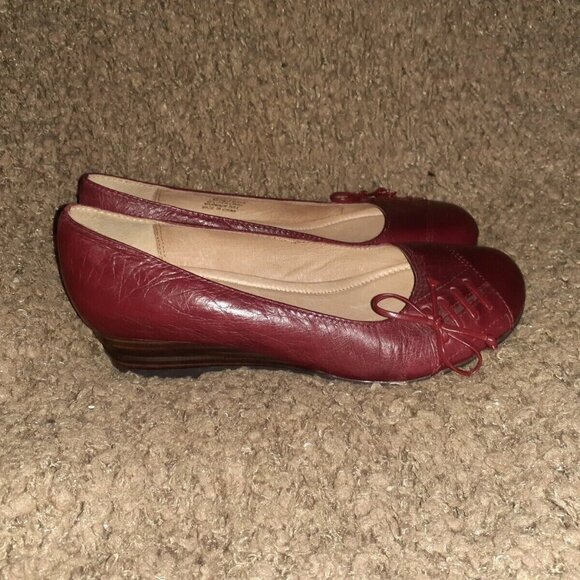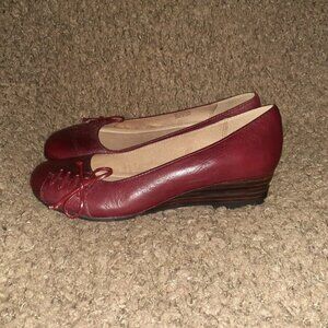 Cute pair of mini-wedge burgundy red leather ballet style shoes.