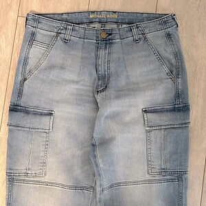 Michael Kors cotton cargo style denim jeans with zipper and elastic ankle. Vintage wash. Stretch, slant front/cargo/small front/back pockets. Excellent condition.