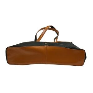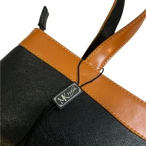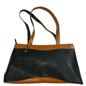 Stylish tote bag. Black and tan colour scheme. Two shoulder straps. Zipper closure. Subtle stitching detail. Looks great with many outfits.