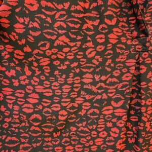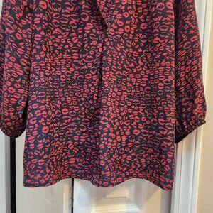 Joie 100% SILK women's blouse, size medium-large, 3/4 length sleeves, black background with red lipstick kisses. Soft and flowy.
