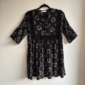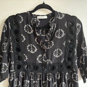Beautiful black and white silk mini dress from French label Sandro. Features a peace sign and daisy print, with openwork embroidery above the waist and along the bodice sides.