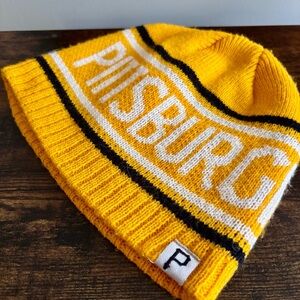 Pittsburgh Pirates O/S yellow and black knit beanie with bold lettering. Perfect for cold weather and supporting your MLB team.