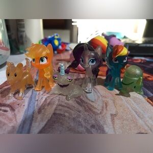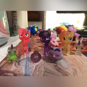 Have been collecting mlp stuff for a couple years now. Though with moving out soon I don’t have the room nor time to collect anymore. I have 20 little mlp g4 blind bag figures in varying conditions, the mane six in larger forms, AJ, fluttershy, and pinkie missing their tails, but otherwise okay condition, a mini set of the mane six and their pets, two Equestria (possibly cutie mark crew too) girl rainbow dashes, same figure, both quite small, around the same size as the blind bag figures. Three mlp squishy things that look silly as hell. Sweetie Belle, Twilight, and Rainbow Dash. Five cutie mark crew toys, (AJ, DJ, mermaid twilight, rarity, and spitfire), four figurines with sculpted hair but brushable tails (rarity, Twilight, Fluttershy, DJ) a random Alicorn twilight who’s also a brushable tail one, an MLP movie sitting rainbow dash, one small random pink pony, an old generation purple mini, an Izzy and Sunny set, (complete with accessories) and finally, a set of Derpy/Muffins/Ditzy Doo card sleeves.